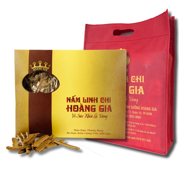Sản phẩm Nấm Linh Chi Đỏ Việt Nam Hoàng Gia 500g Thái Lát Trong hộp sản phẩm sẽ có cất đầy đủ những thông tin về tác dụng, cách thức dùng của linh chi, túi linh chi được hút chân không có gói hút ẩm, túi zip bảo quản sau khi mở bịch cho linh chi.